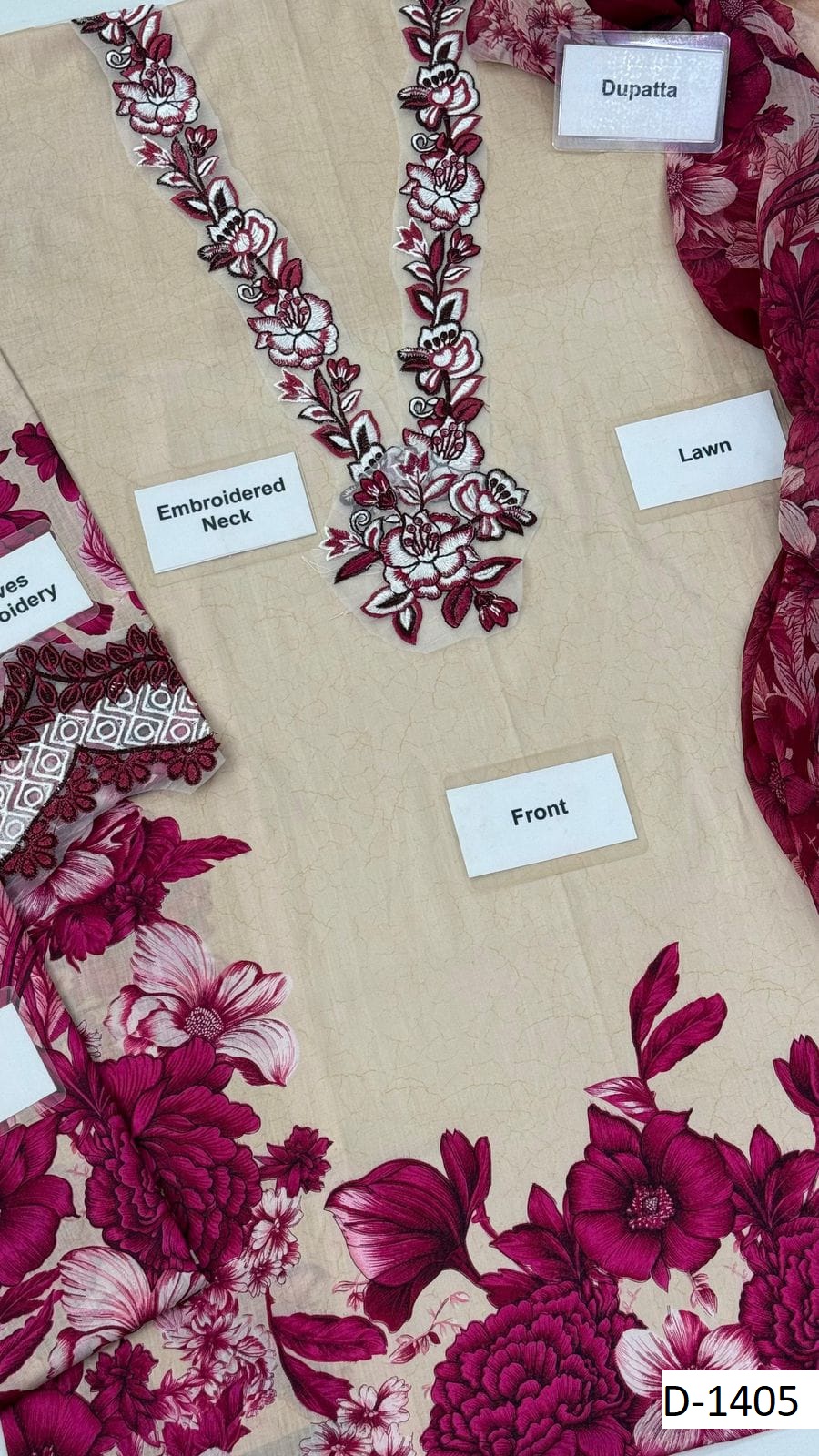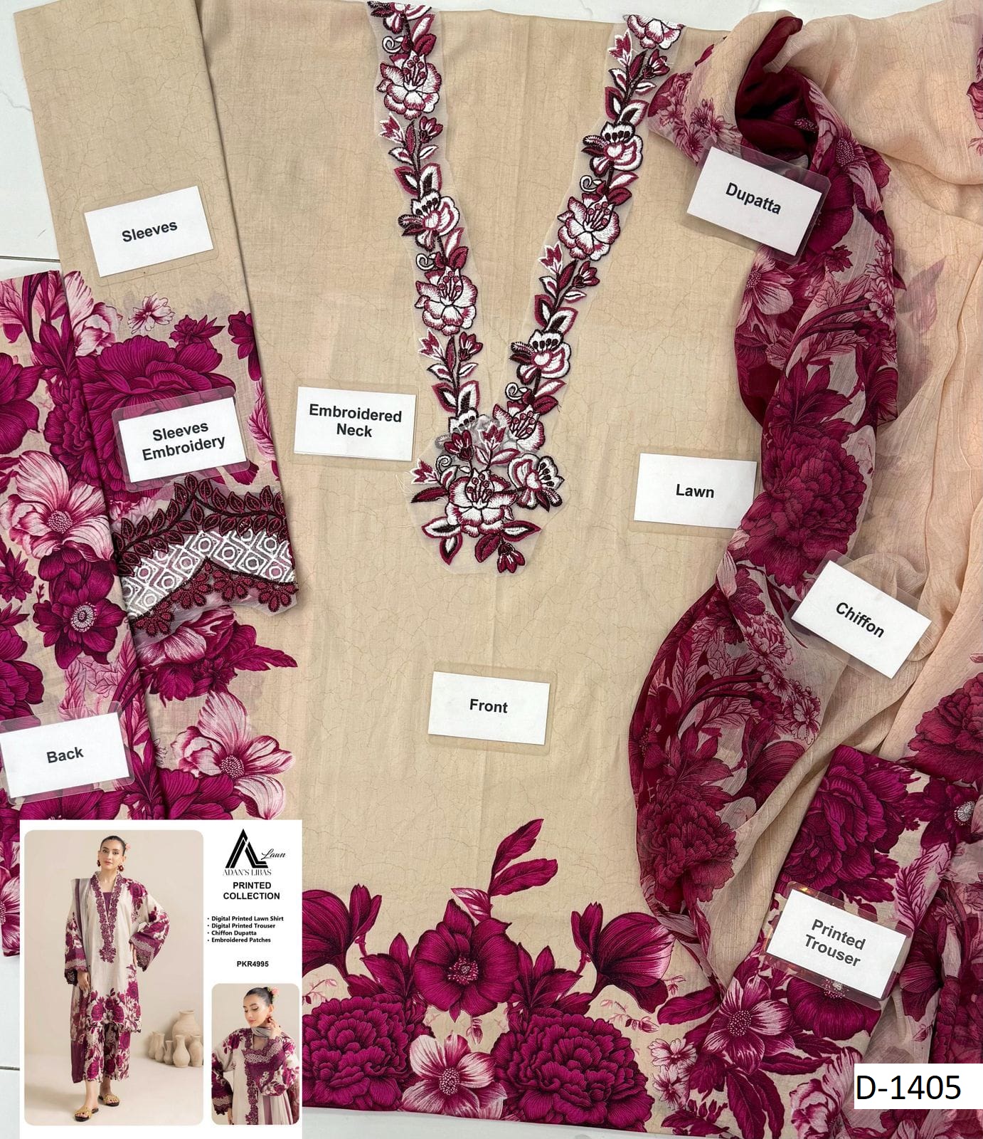 Bring style and elegance to your wardrobe with D-1405 by HR Designers – a stunning fusion of lawn and chiffon that’s both lightweight and chic. With printed details and delicate embroidery, this outfit is perfect for casual gatherings, festive lunches, or summer events.