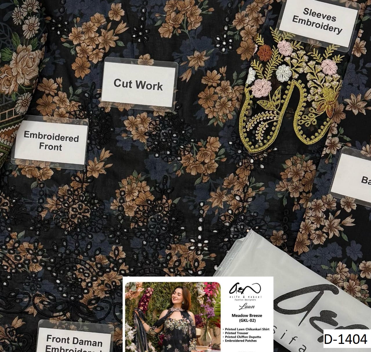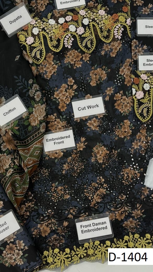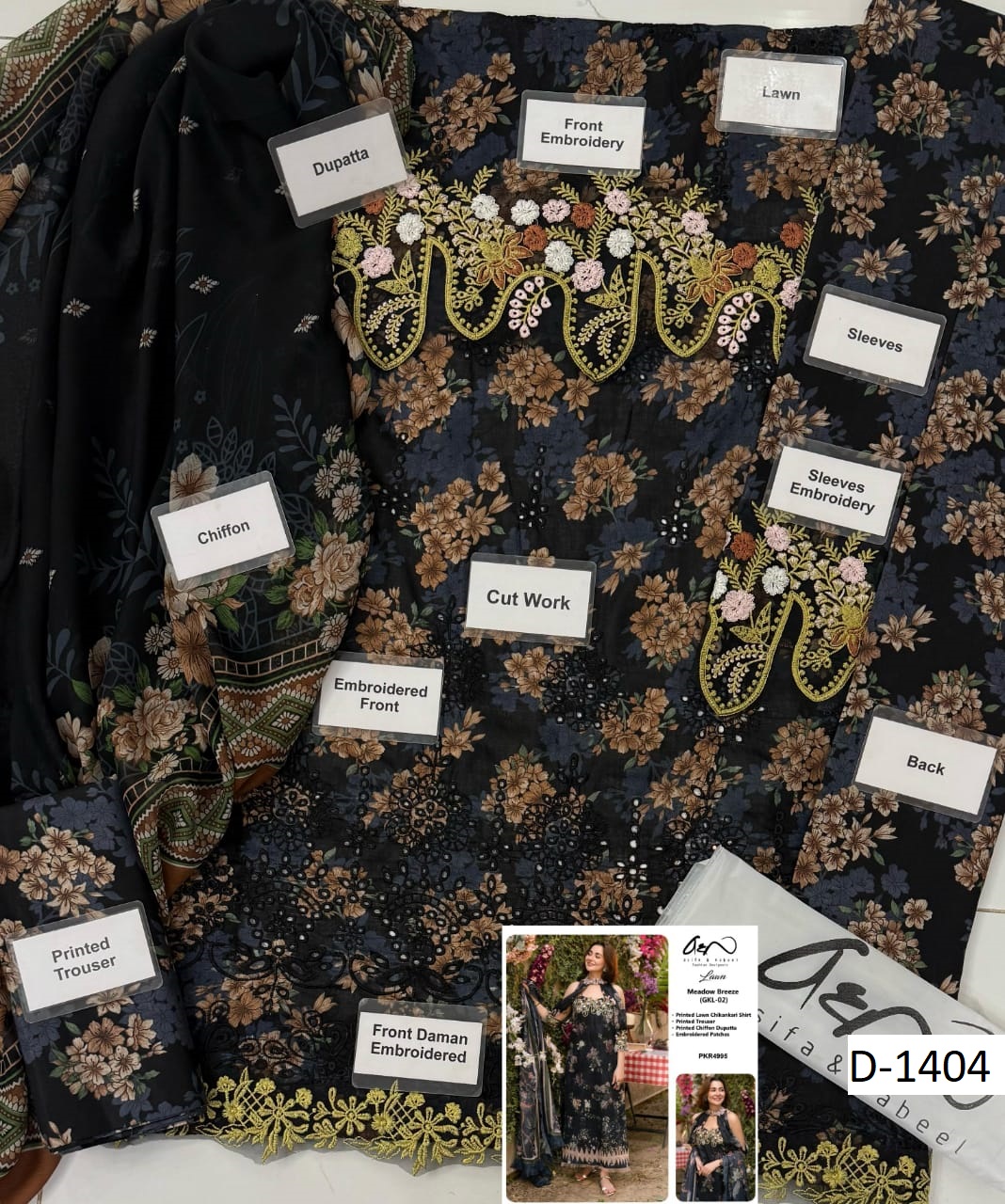 Step into effortless elegance with D-1404, a beautiful blend of lawn and chiffon fabrics crafted for comfort and style. Designed with digital prints and delicate embroidery, this outfit is perfect for everyday wear, festive lunches, and summer evenings.