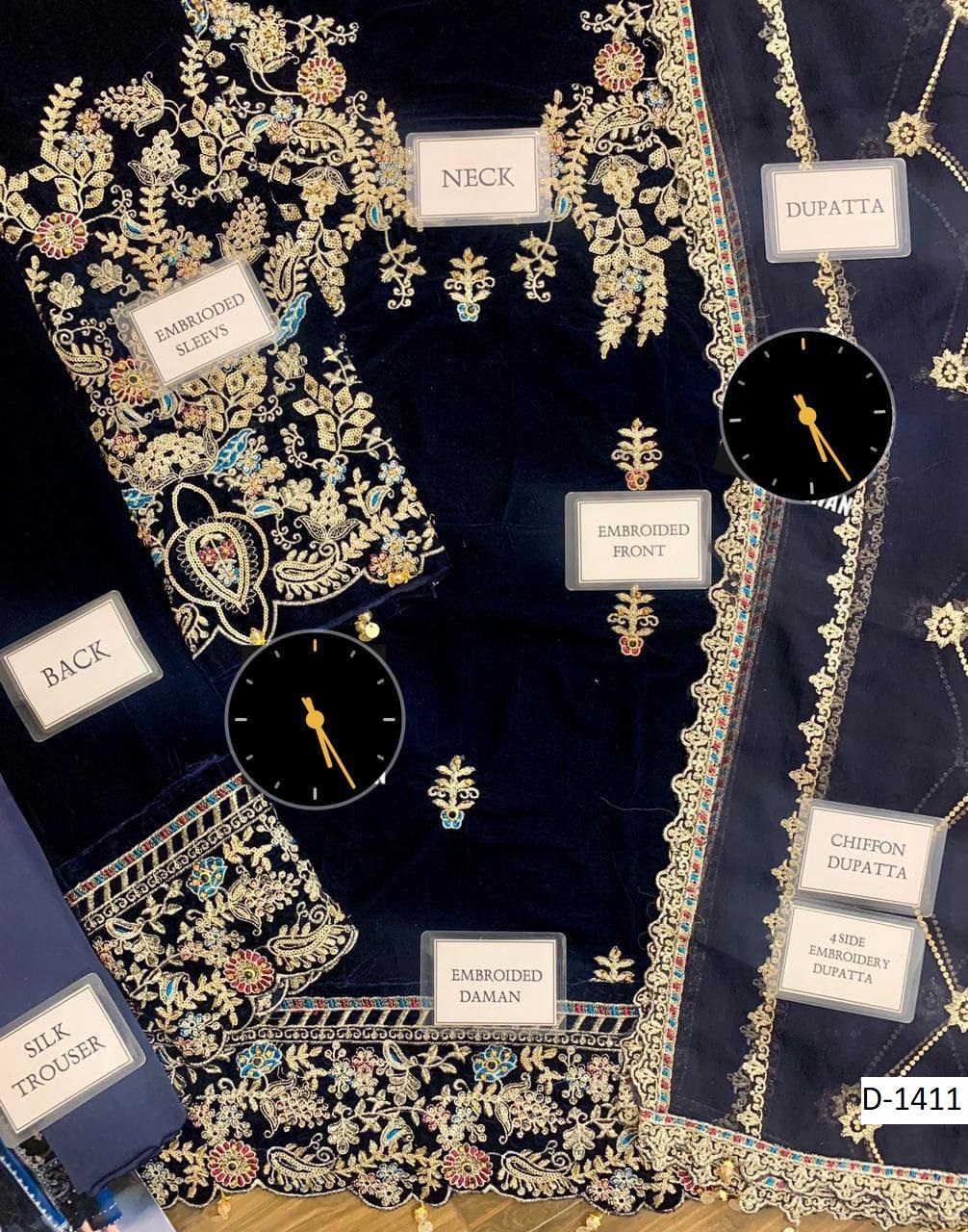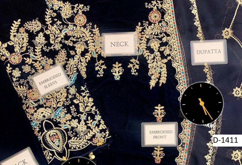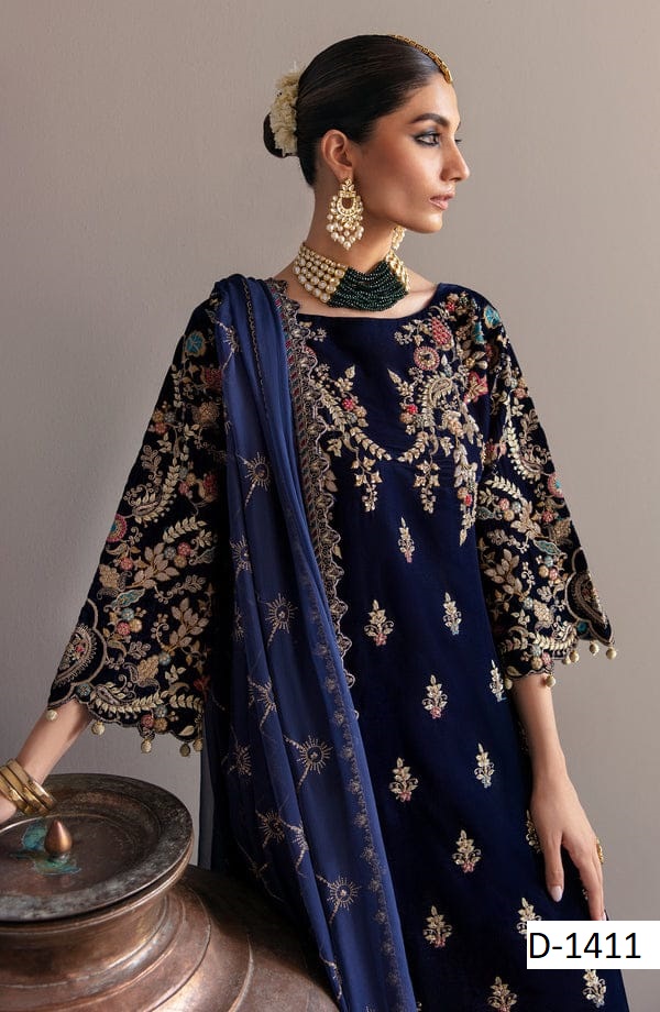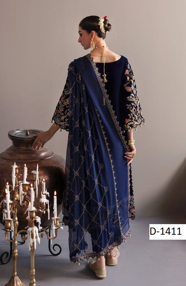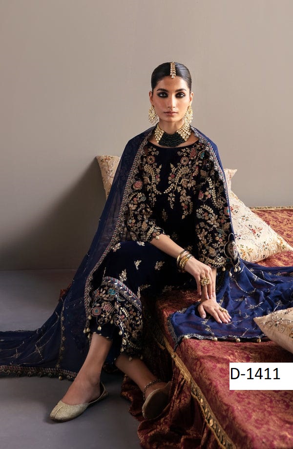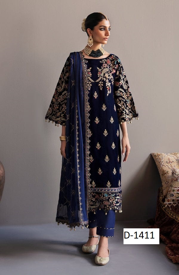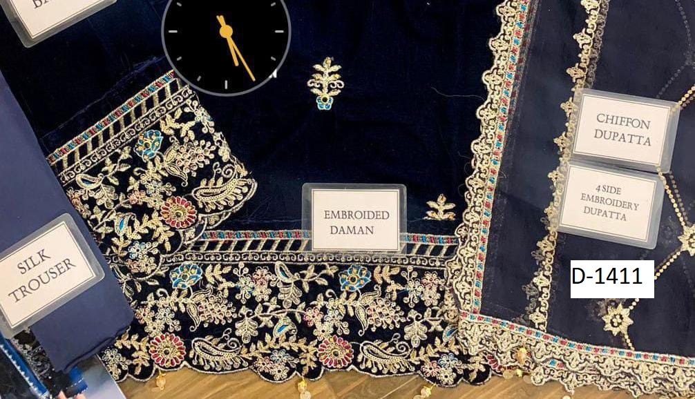 Step into timeless elegance with D-1411, a premium velvet embroidered suit paired with a chiffon embroidered dupatta and silk trouser. Perfectly crafted for weddings, parties, and festive occasions, this 3-piece outfit combines rich fabrics with intricate embroidery for a regal finish.
