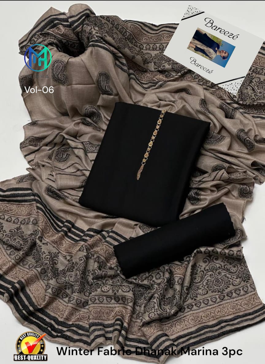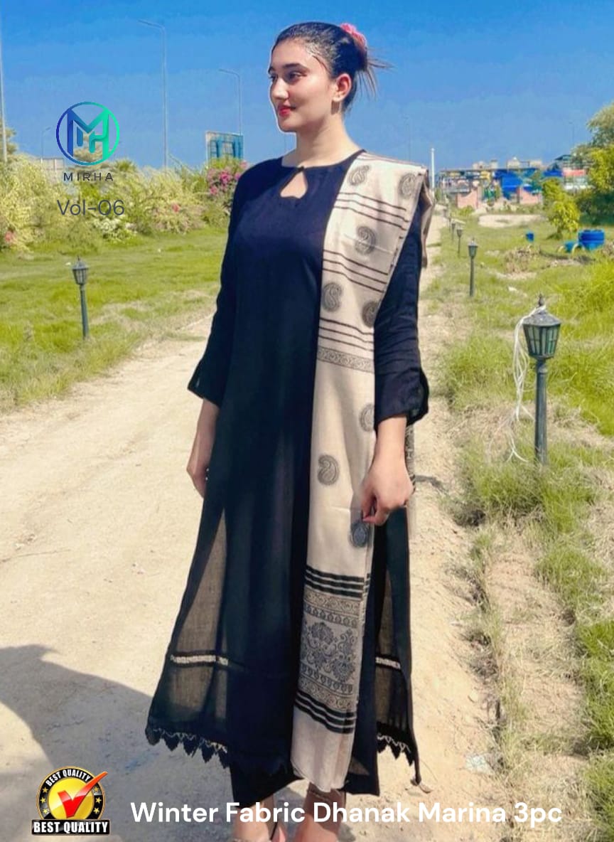 Embrace the winter elegance with our 3-piece Fancy Marina Suit, crafted from pure soft Marina fabric. The set includes a warm plain shirt, matching trouser, and a luxurious Jacquard Tilka Shawl with heavy velvet work — the perfect mix of comfort and festive style.