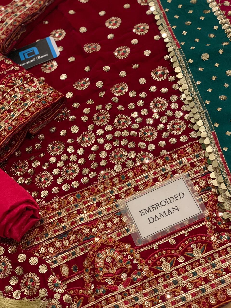 *Velvet fully heavy embroidered spengle work front with fully heavy velvet embroidered spengle work daman boarder with embroidered spengle work soldier bunches*