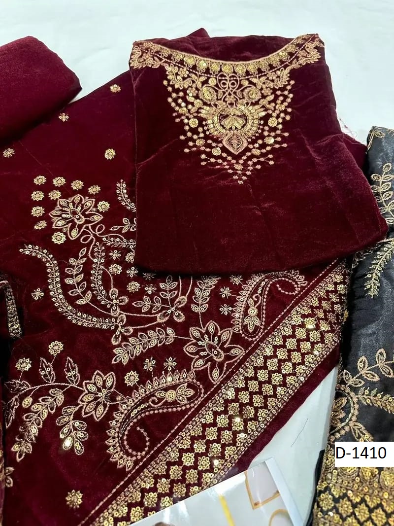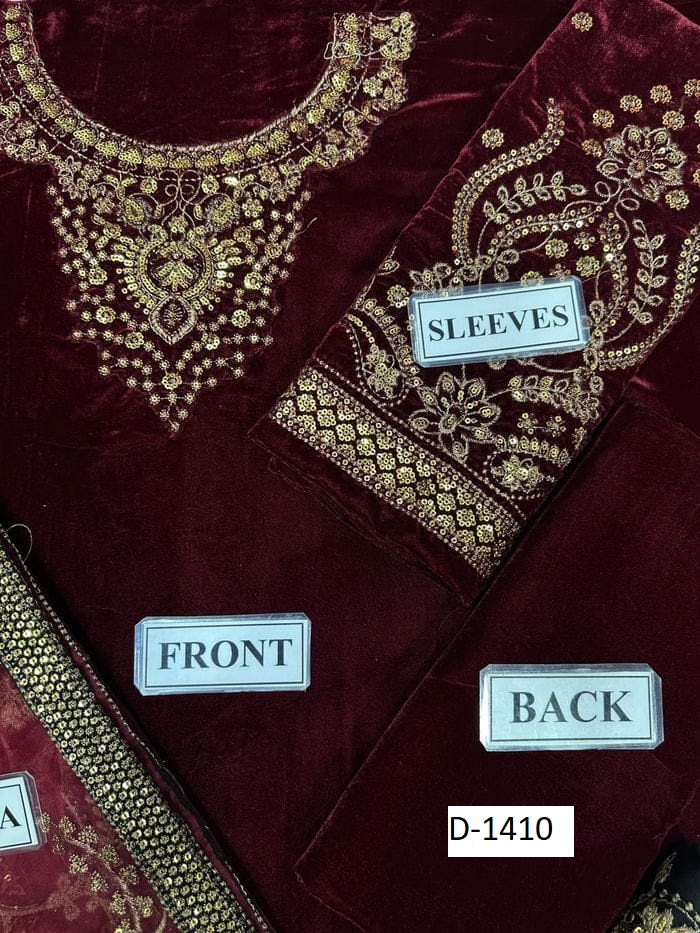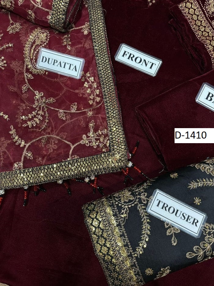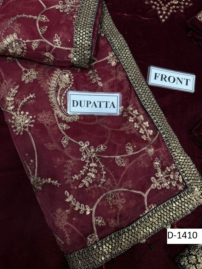 Unveil elegance with D-1410, a premium 3-piece velvet embroidered suit crafted in Pure Velvet (Micro 9000), paired with an organza dupatta and pure silk trouser. Designed with intricate embroidery and fine detailing, this outfit is perfect for weddings, festive occasions, and formal gatherings.