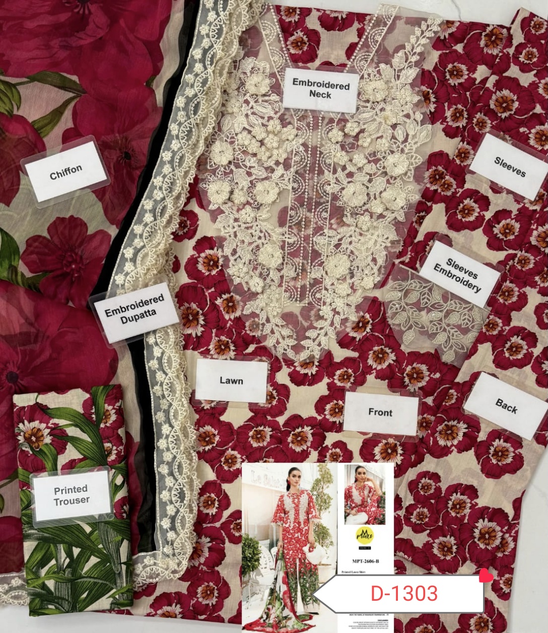 - *Dupatta:* Printed Chiffon with 4-Sided Embroidered Lace