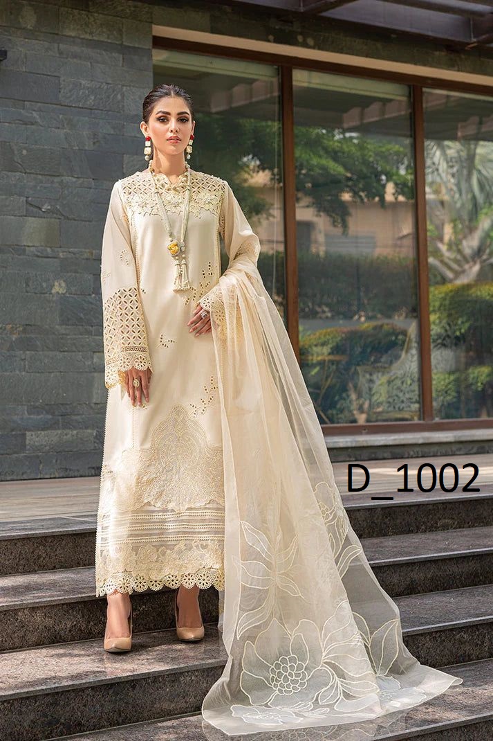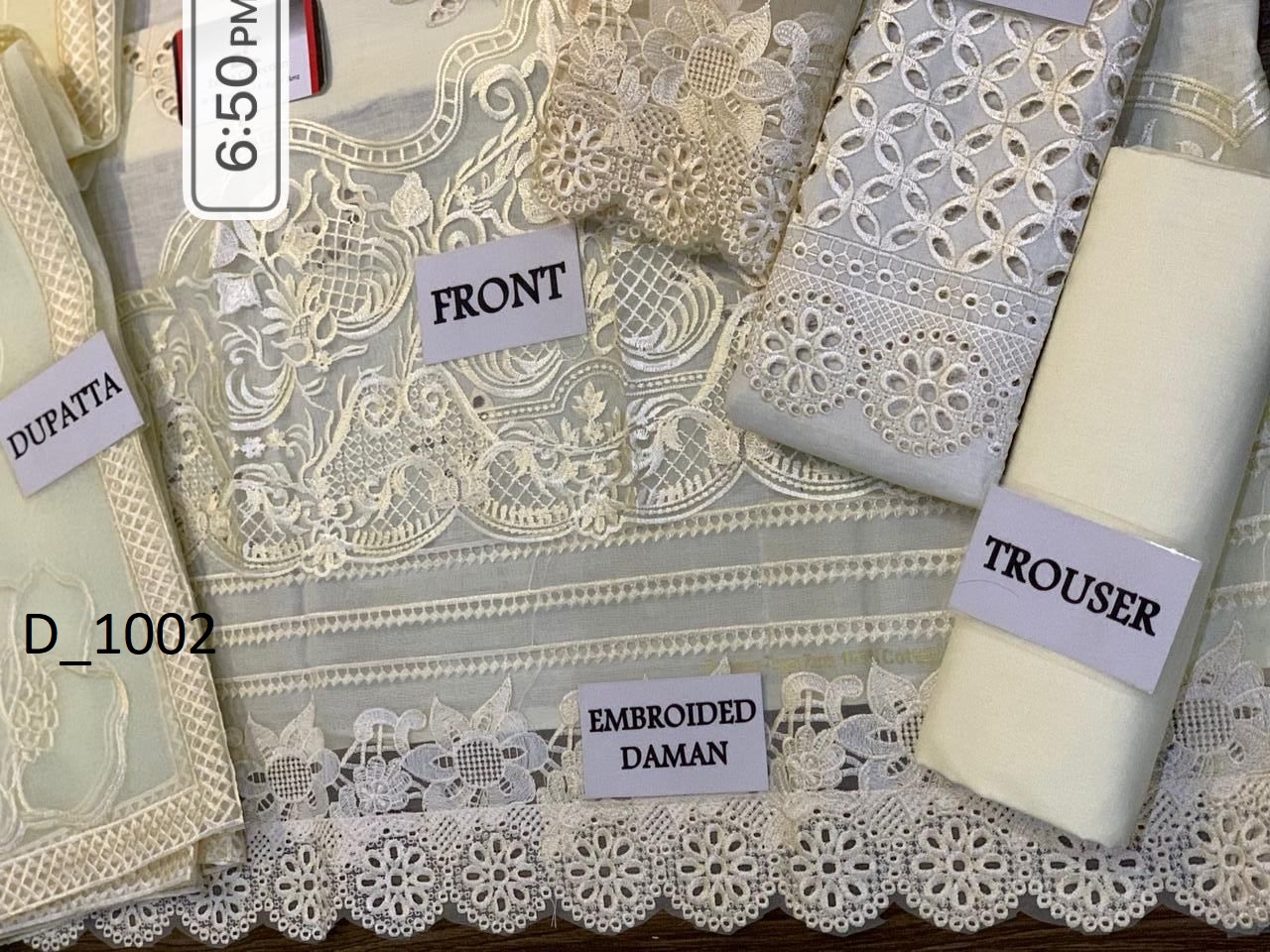 *NEW ARRIVAL* *MUSHQ* presents *Valentina Creme-24* FABRIC DETAILS: ✨ *Chikankari Embroidered* Front ✨ *Embroidered* Back with patch ✨ *Chikankari Embroidered* Sleeves ✨ *Daman Embroidered* Patch ✨ *Neckline Patch* ✨ *Sleeves Lace* ✨ *Organza* fully heavy *embroidered* Dupatta ✨ *Ready-to-wear* ✨ *Dyed* Trouser
