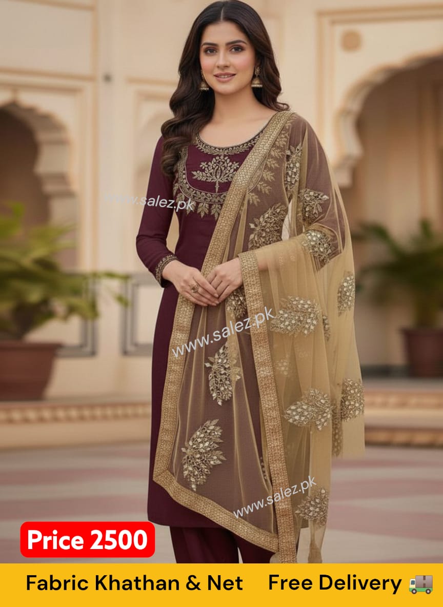 Elevate your festive look with our Wedding Season Party Wear 3PC Dress, crafted in premium Katan fabric with intricate mirror work detailing. Designed for elegance and comfort, this outfit is perfect for weddings, mehndi, dholki, and special occasions.